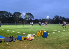 Al het gras zou er deze week moeten liggen. Dan nog de lijnen insnijden, 250 m3 zand en kurk erin, hekwerk, de palen plaatsen enz.